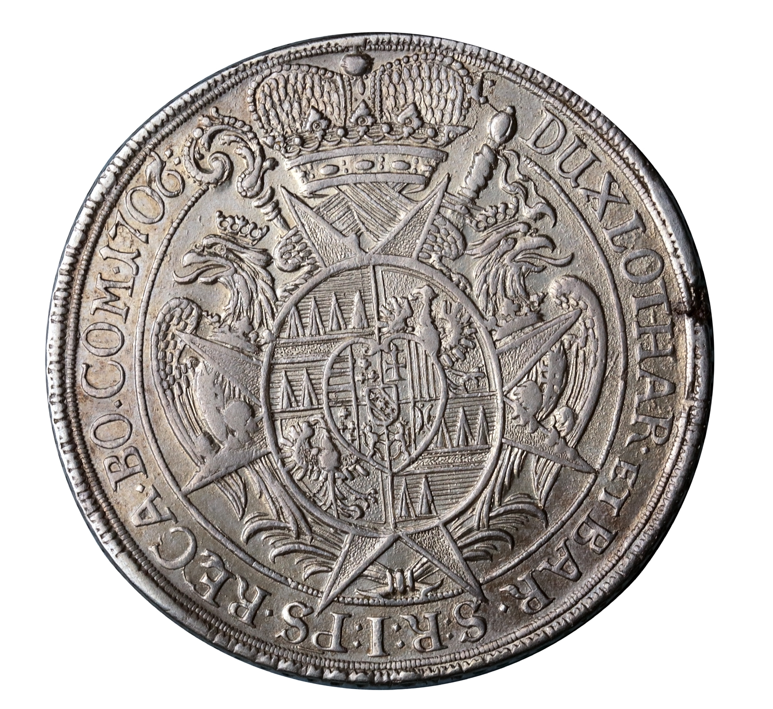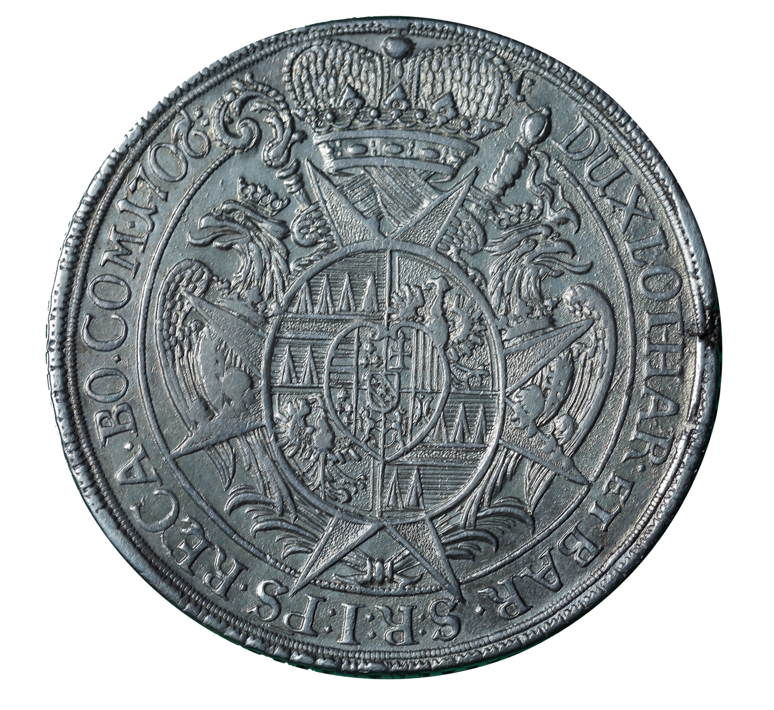 Vzácný tolar Karla III. Lotrinského, razidlo s přerytým letopočtem z roku 1703. Pěkné detaily, vada razidla v averzu a vada střížku na hraně. Neměl očko, ani závěs. Mince je originál, za což ručíme doživotně vrácením peněz.
