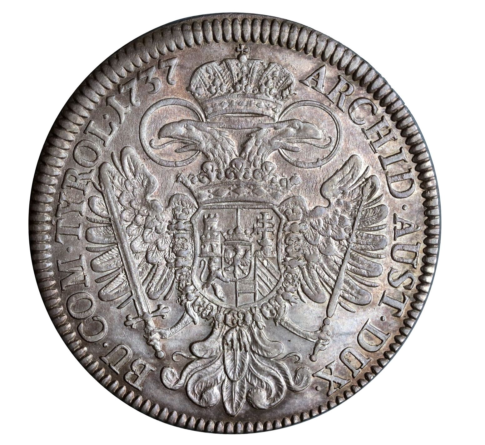 Velmi pěkně zachovalý tolar z roku 1737, mincovna Hall s číslem 3 pod bustou. Lehká patina, v opisech v averzu ražební lesk, v reverzu v plochách. Neměl očko, ani závěs. Mince je originál, za což ručíme doživotně vrácením peněz.