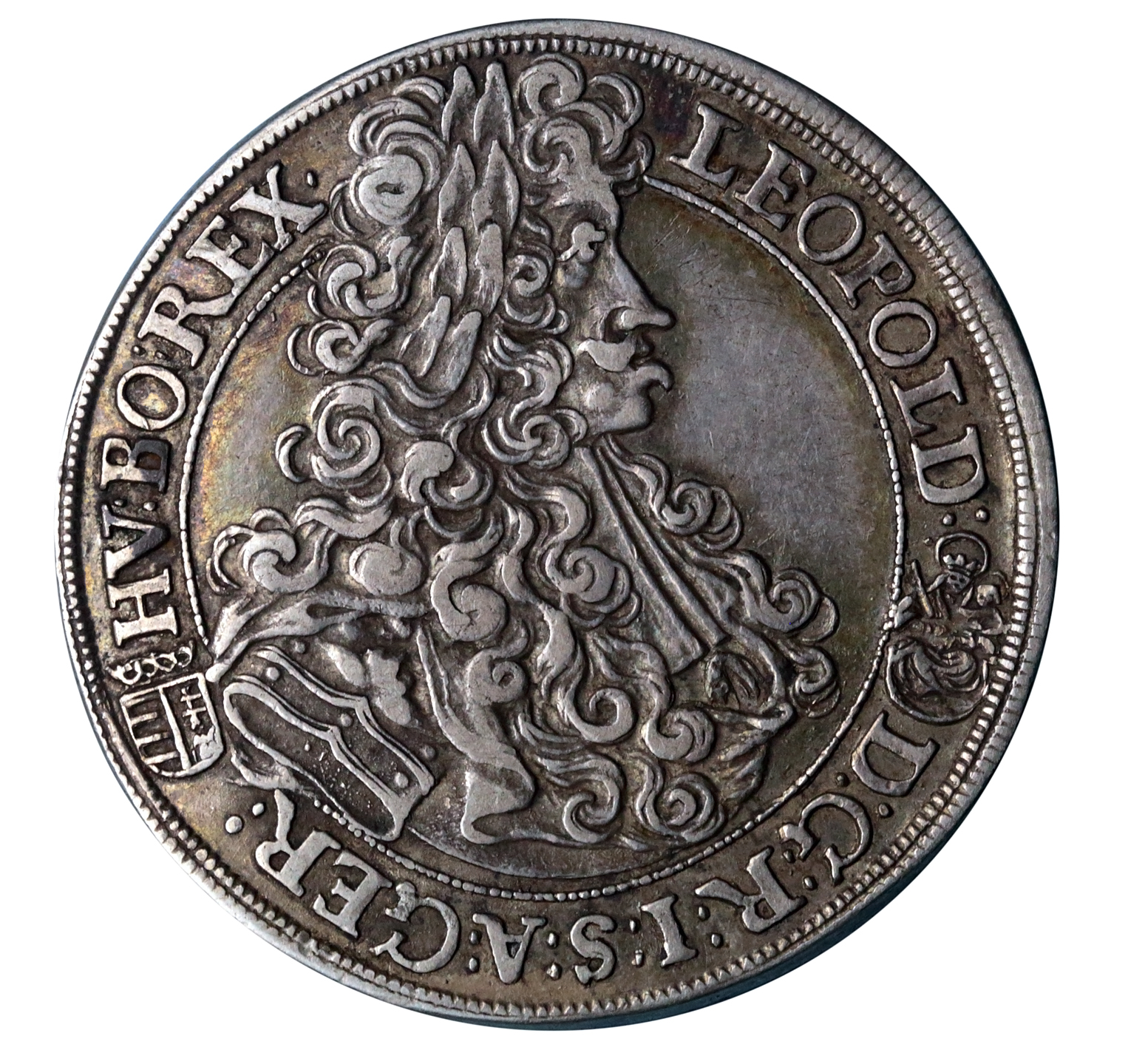 Velmi pěkně zachovalý 1/2 tolar ročník 1703 z mincovny Kremnice s minimem mikrorysek, hezká patina s barevným nádechem v plochách. Neměl očko, ani závěs. Mince je originál, za což ručíme doživotně vrácením peněz.
