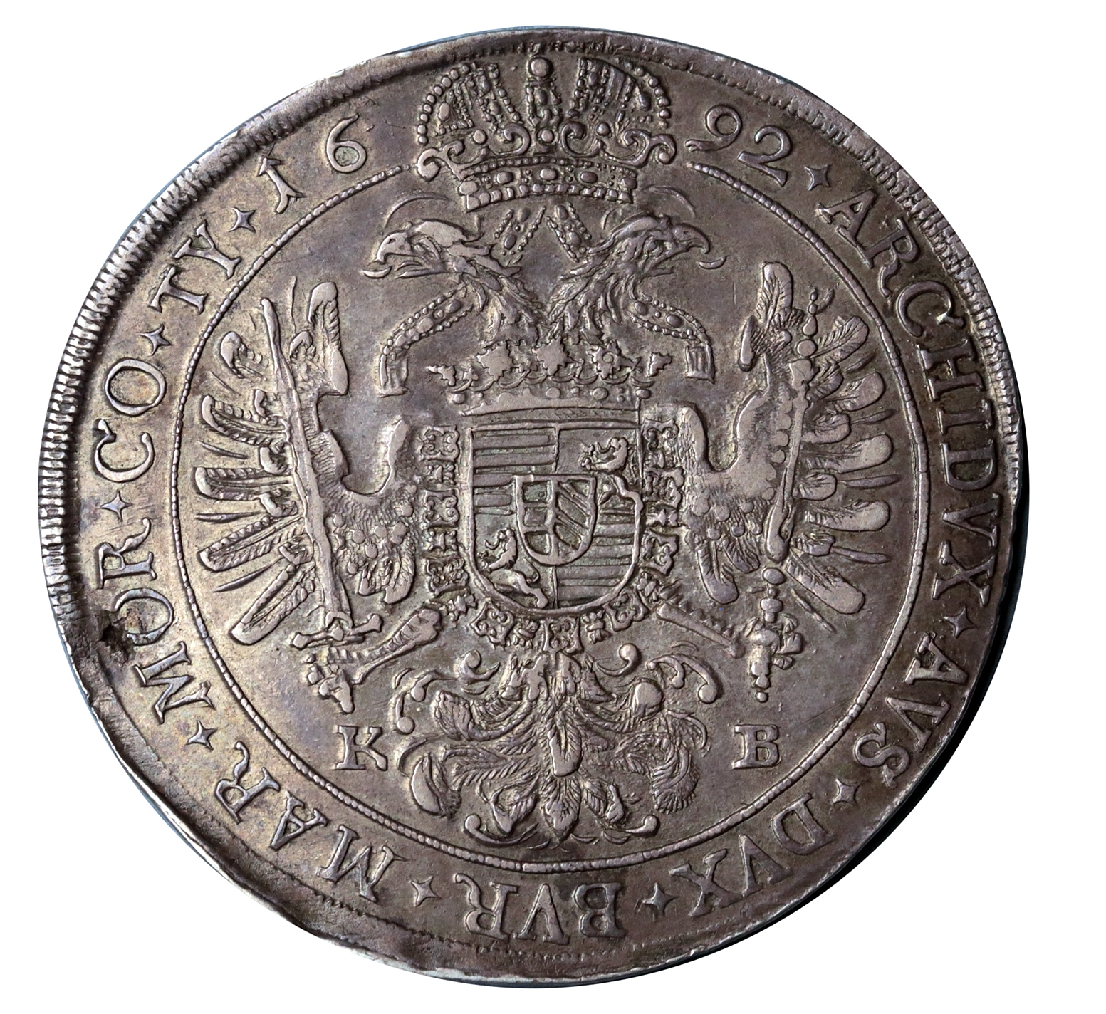 Tolar Leopolda I. z mincovny Kremnice ve velmi pěkné zachovalosti. V averzu dr. rysky u nosu panovníka, v reverzu dr. vada střížku mezi 8. a 9. hodinou. Neměl očko, ani závěs. Mince je originál, za což ručíme doživotně vrácením peněz.