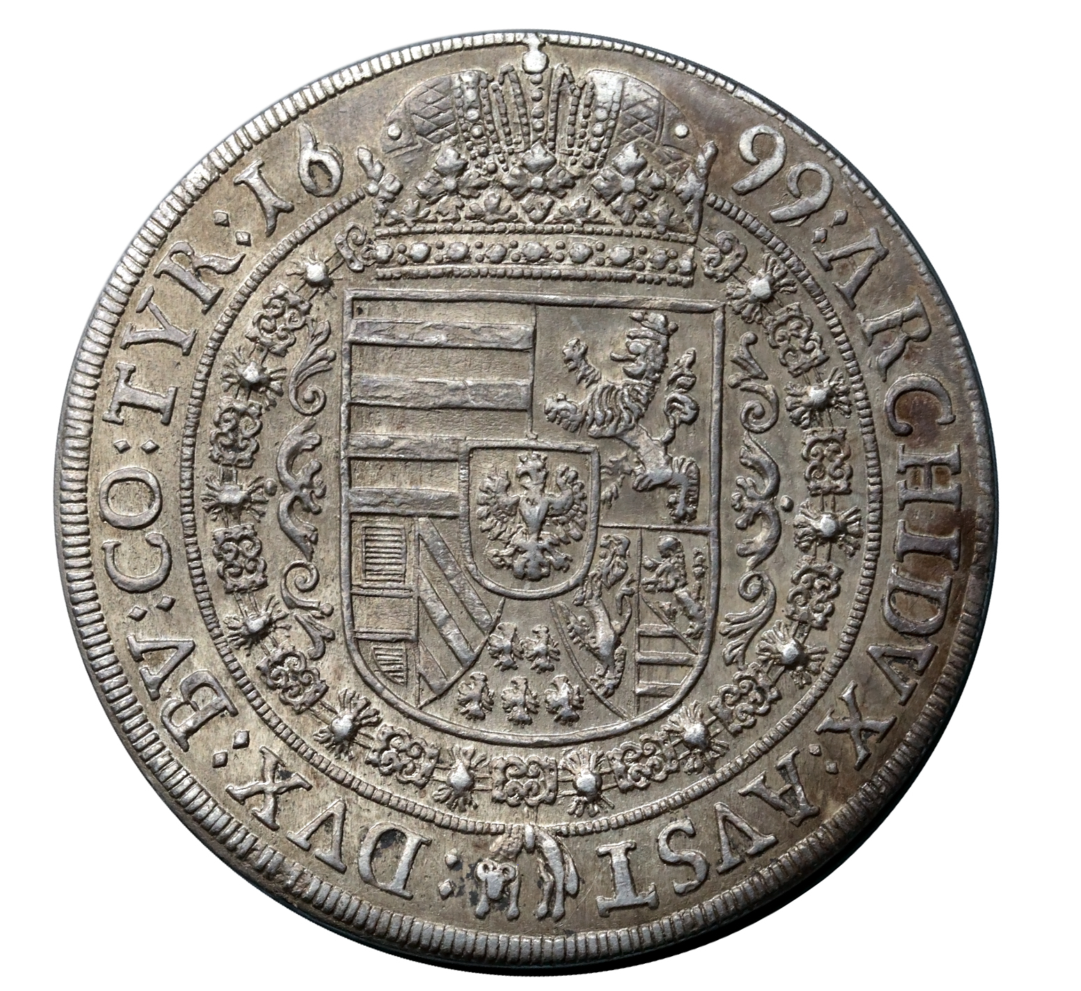 Nádherně zachovalý tolar z 1699 v patině. Mince byla vydražena na aukci Zottl s provizí za 900 euro (lístek z aukce v roce 2022 přiložen), zde hodnoceno vysokým hodnocením jako vorzüglich